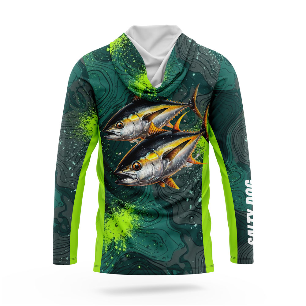 The Toxic Tuna Hoodie gives you extra coverage without the restriction of a built-in mask. It features the same electric green accents and topographic chart design as the rest of the series, but with a standard hood configuration.