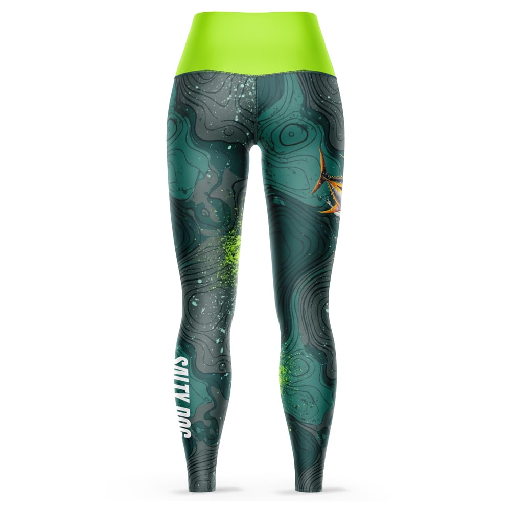 The Toxic Tuna Ladies Leggings bring the deep-water topographic print and neon green accents to a high-performance activewear cut. Whether you are on the boat, at the gym, or going for a run, these leggings offer full coverage with a bold look.